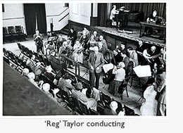 H. R. Taylor, known as 'Reg' to his friends, had many and varied careers, but his lifelong passion, arising from his love of the clarinet, was orchestral music. In 1946 he joined the Cheam Concert Orchestra, founded before the First World War, and became its Musical Director in 1962. Under him the Orchestra continued to give charity concerts until failing eyesight forced him to retire in 1988. At the time he had a library of over 1,000 standard orchestral works, which his Executors put to charitable use.